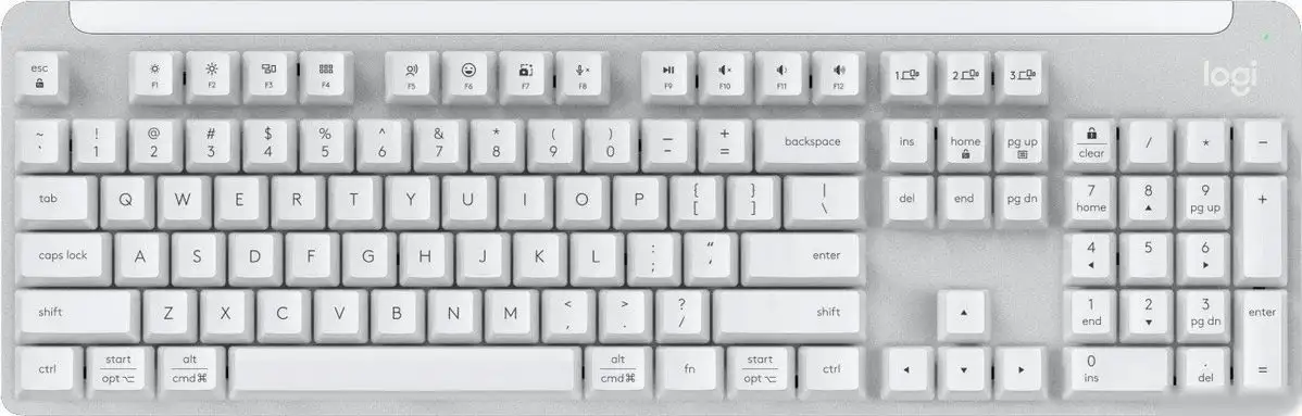 стандартная для ПК/для компьютеров Apple/для iPad/для устройств Android/для устройств ChromeOS, механическая, ход линейный, пластик, интерфейс подключения - радио/Bluetooth, подсветка, кириллица: нет, цвет белый