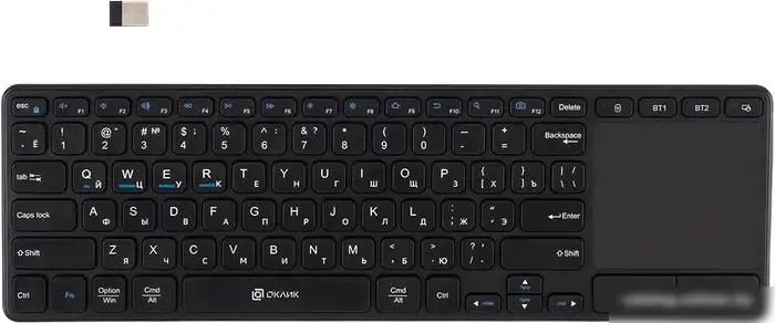 Клавиатура Oklick K614W — это компактное устройство с размером примерно три четверти стандартной клавиатуры, которое удобно брать с собой и использовать на различных устройствах. Она подключается по Bluetooth или через радиосигнал на расстоянии до 10 метров, что позволяет свободно перемещаться и легко переключаться между двумя гаджетами. У клавиатуры есть сенсорная панель и встроенный ролик для управления громкостью, что делает работу с ней более удобной. Корпус изготовлен из пластика, а клавиши расположены в низком штровом стиле, что позволяет быстро и комфортно набирать текст. Она подключается к ПК, Apple, Android-устройствам, iPad и Smart TV. В комплект входят батарейки и USB-приемник для подключения, а размеры и вес позволяют брать клавиатуру с собой или использовать дома.