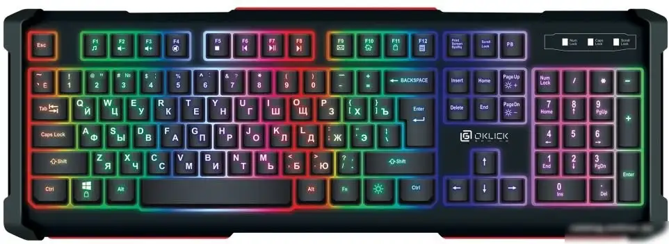Клавиатура Oklick 717G Black Death — это игровая модель с мембранными переключателями, которая обеспечивает комфортную и быструю игру. Она подключается к ПК через USB-A и не требует беспроводных соединений. Клавиатура выполнена в классическом высоком корпусе из пластика с яркой многоцветной подсветкой клавиш, которая помогает лучше ориентироваться в темноте во время игры. Цифровой блок позволяет быстро вводить цифры, а наличие кириллицы делает использование удобным для русскоязычных пользователей. Размеры клавиатуры — 465 мм в ширину и 270 мм в глубину, а вес около 790 г обеспечивает стабильность на столе. Несмотря на отсутствие дополнительных функций, таких как USB-порты или подставка под запястья, она остаётся удобной и надёжной для длительной игры. Модель не обладает влагозащитой или пыле-изоляцией, поэтому стоит аккуратно обращаться с устройством. Эта клавиатура отлично подходит для геймеров, которые ценят яркое оформление и качественную работу клавиш.