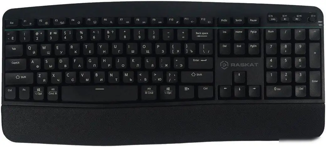 Клавиатура Raskat K006 — это полноценная офисная клавиатура с классической формой и высоким клавишами, которая подходит для ПК и компьютеров Apple. Она подключается через USB-A, Bluetooth или радио и не требует проводов, что обеспечивает свободу в использовании. Устройство оснащено цифровым блоком и подставкой под запястье для комфортной работы. Корпус выполнен из прочного пластика, а длина кабеля составляет 1 метр. Встроенный аккумулятор емкостью 300 мАч обеспечивает работу без постоянного подключения к источнику питания. Клавиши не подсвечиваются и не имеют сенсорных элементов, что делает клавиатуру максимально простой. Подставка под запястье помогает снизить утомление при длительной работе за компьютером. Особых функций, таких как подсветка или возможность переключения между устройствами, в этой модели нет. В целом, эта клавиатура удобна для ежедневного использования в офисе или дома.