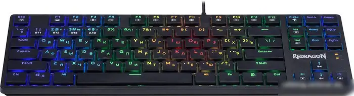Клавиатура Redragon Anubis — это игровая клавиатура с механическими переключателями Outemu Tea, которые обеспечивают тихий и тактильный отклик. Она подключается через USB, Bluetooth или радио и работает беспроводным способом, что делает её удобной для использования без проводов. Размер клавиатуры составляет 80% (TKL), она легкая и компактная — всего 530 г, а длина кабеля — 1.8 м. Клавиши имеют подсветку RGB, что позволяет создавать яркий эффект при игре или работе. Клавиатура не имеет цифрового блока и подставки под запястья, но оснащена сменяемыми переключателями и оплеткой кабеля для долговечности. Ее дизайн прост и удобен для повседневного использования.
