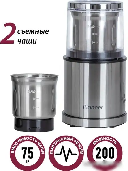 Электрическая кофемолка Pioneer CG230 предназначена для быстрого и удобного измельчения кофейных зёрен. Она оборудована мощным двигателем на 200 Вт и роторным ножом, который создаёт равномерный помол. Вмещает до 75 г зёрен, что позволяет приготовить кофе сразу для нескольких чашек. Корпус изготовлен из прочной нержавеющей стали и окрашен в стильный серебристый цвет. Устройство не регулирует степень помола, но обеспечивает стабильную работу из-за своей конструкции. Блокировка при открытой крышке повышает безопасность при использовании. Кнопка пуска удерживается в нажатом положении для удобства и предотвращает случайные включения. Отсутствие дисплея, порционного помола и регулировки степени помола делает кофемолку простой в эксплуатации. Этот прибор отлично подходит для тех, кто ценит качество и быстрое приготовление кофе.