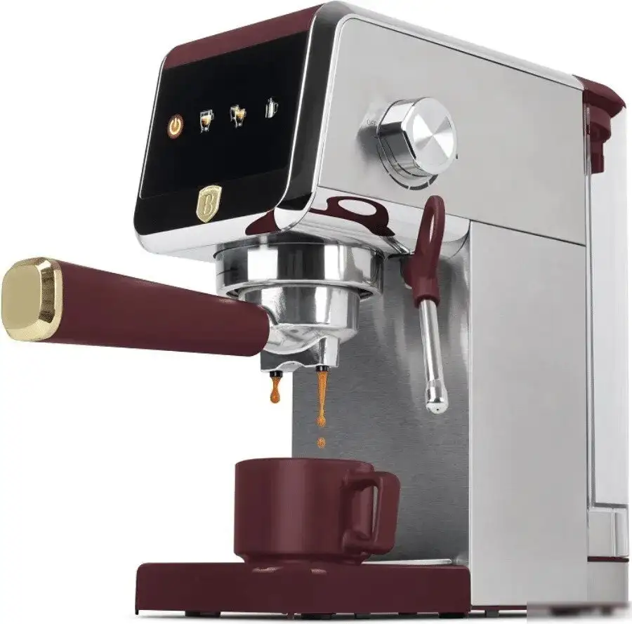 1350 Вт, корпус металл/пластик, капучинатор ручной, используемый кофе: молотый, цвет бордовый/серебристый