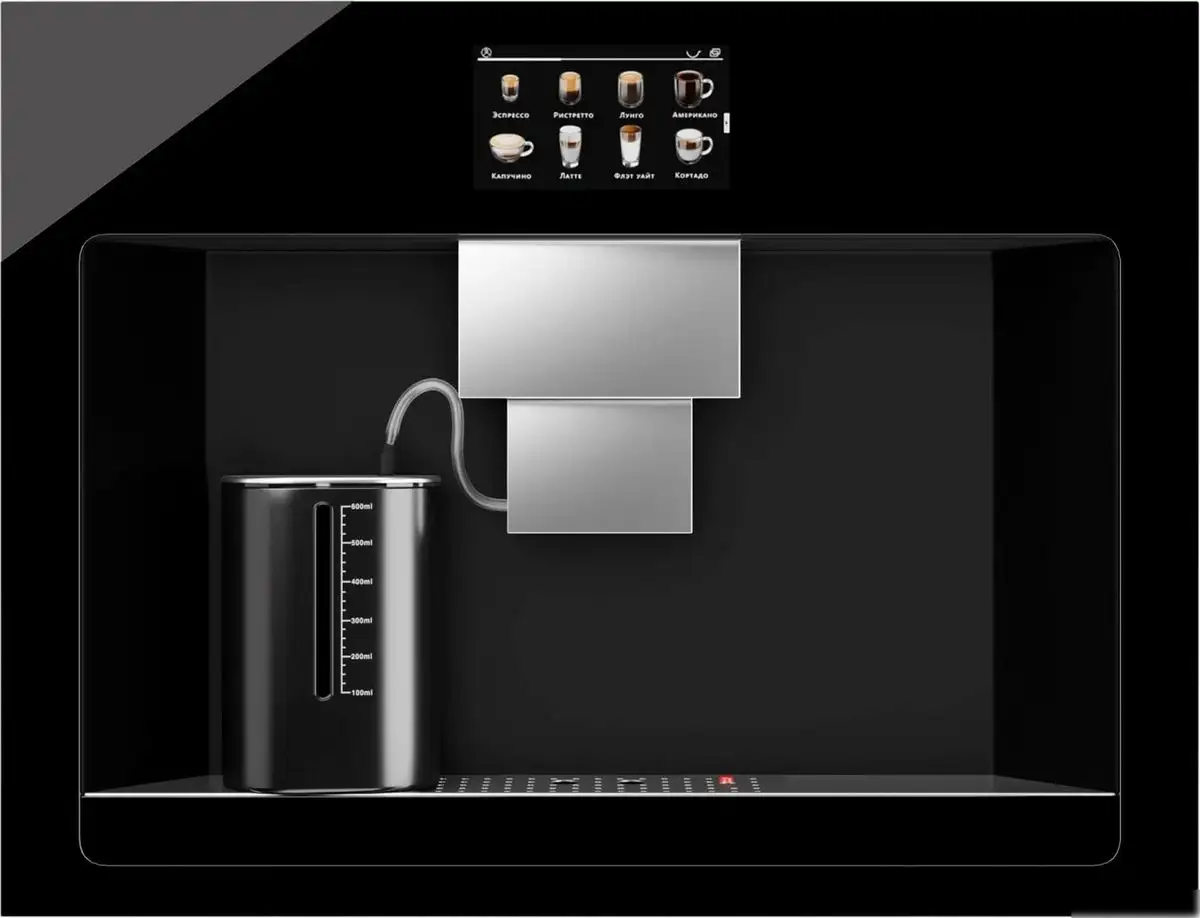 встраиваемая, 1200 Вт, корпус металл/пластик/стекло, капучинатор автоматический, используемый кофе: зерновой, цвет черный