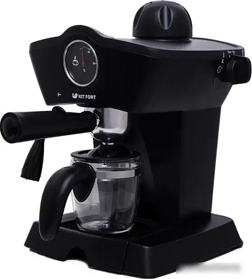 Рожковая бойлерная кофеварка Kitfort KT-706 — это простая и удобная модель для приготовления кофе дома. Она работает с молотым кофе и имеет мощность 800 Вт, что позволяет быстро сделать напиток. В кофеварке есть ручной капучинатор для приготовления капучино и латте, а также стеклянный кофейник на 4 порции. Конструкция сделана из пластика, а корпус — чёрный, что хорошо впишется в кухню. Устройство управляется механически, без сложных настроек и программ. В комплект входит фильтр из нержавеющей стали, который помогает готовить чистый и вкусный кофе.
