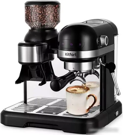 Рожковая помповая кофеварка Kitfort KT-7126 предназначена для домашних使用. Она работает от электросети с мощностью 1550 Вт и создает давление 19 бар, что позволяет приготовить насыщенный кофе. В кофеварке есть светодиодный экран для удобного управления и возможность регулировать степень помола и объем порции. Емкость для воды составляет 1,4 литра, а отсек для кофе — 200 г, что обеспечивает приготовление нескольких чашек подряд. Корпус выполнен из металла и пластика в цвете нержавеющей стали и черного цвета, что делает ее прочной и стильной.