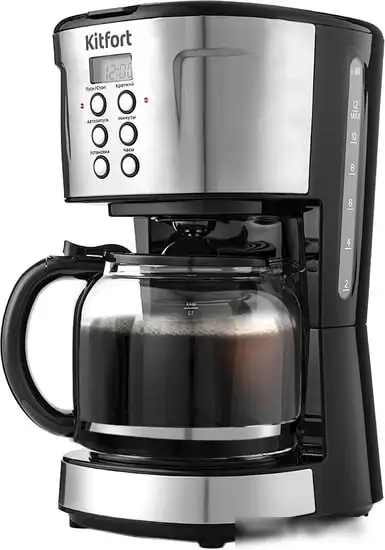 Кофеварка Kitfort KT-731 — это удобное устройство для приготовления кофе дома. Она свободностоящая и работает на молотом кофе, что позволяет выбрать любой сорт. У этой модели есть два бойлера и стеклянный кофейник, а емкость для воды составляет 1.6 литра. Управление происходит через электронный ЖК-экран, а есть функция отложенного старта. Вы можете регулировать крепость напитка по двум степеням и настроить температуру по своему вкусу. Благодаря противокапельной системе, кофе можно наливать, не выключая прибор, что удобно во время приготовления.