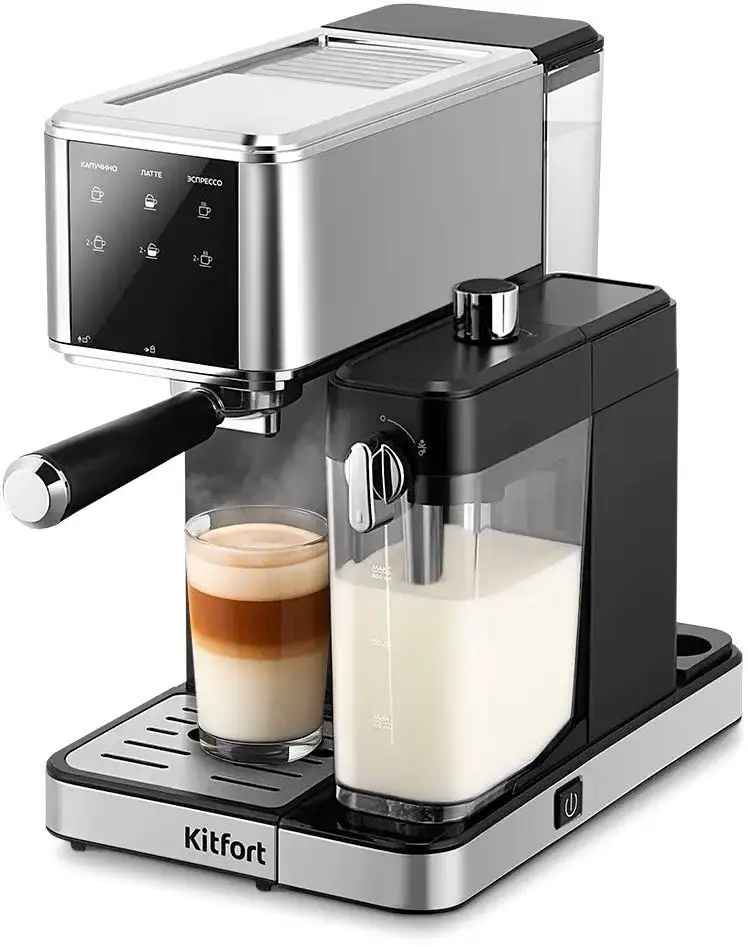 Рожковая кофеварка Kitfort KT-7693 идеально подходит для домашнего использования. Она подключается к сети и работает от помпового давления в 20 бар, что обеспечивает качественный эспрессо и молочные напитки. Встроенные два бойлера позволяют одновременно готовить кофе и молочную пену. Благодаря сенсорному управлению и светодиодной индикации, использовать устройство удобно и просто. Кофеварка имеет емкость для воды 1 литр и встроенную емкость для молока 0,6 литра, что позволяет готовить несколько напитков подряд. Встроенный капучинатор помогает быстро приготовить капучино и латте в одно касание. Площадка для подогрева чашек сохраняет напитки горячими дольше. Металлический фильтр и возможность регулировать объем порции делают использование более комфортным. Эта модель сочетает в себе высокую функциональность и современный дизайн с серебристым и черным корпусом.