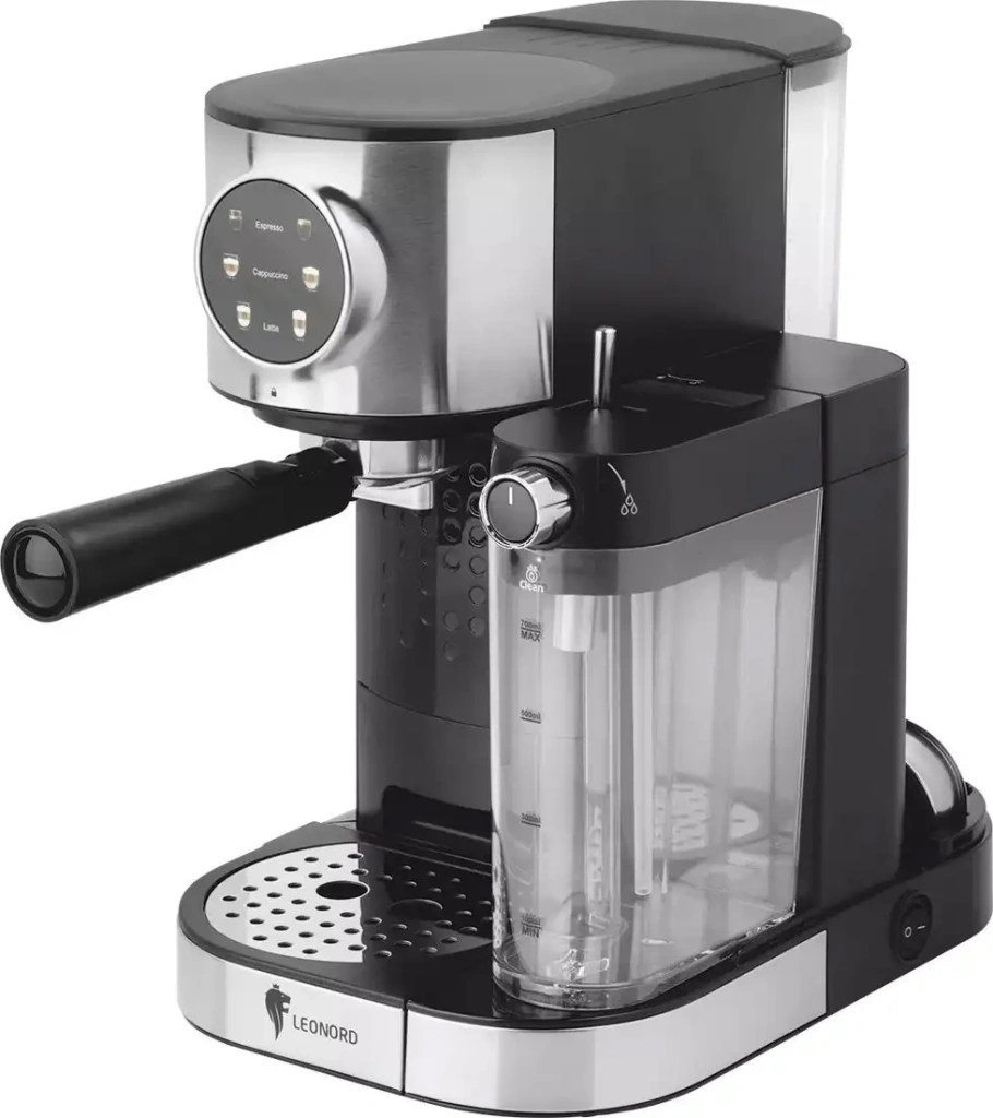 Рожковая кофеварка Leonord LE-1754M предназначена для домашнего использования и работает от электросети с мощностью 1450 Вт и давлением 15 бар. Она изготовлена из металла и пластика в серебристом и черном цвете, что делает ее стильной и прочной. Благодаря сенсорному управлению и ЖК-экрану легко настроить приготовление эспрессо, капучино или латте одним нажатием. В кофеварке есть автоматический капучинатор и емкость для молока на 0.75 литров, что удобно для приготовления молочных напитков. Емкость для воды составляет 1.2 литра, что позволяет приготовить несколько чашек подряд без доливки. Устройство регулирует объем порции и обеспечивает высокое качество напитков по выбранной крепости и температуре. Кофея не подключается к водопроводу и не имеет функции отсроченного старта. Она обладает простым управлением и современным дизайном, подходящим для everyday использования.