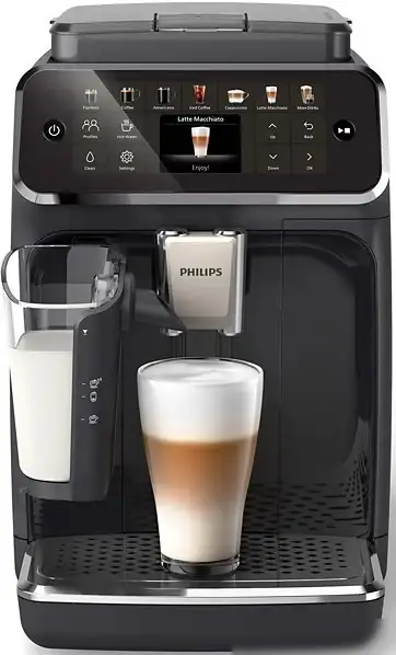 Кофемашина Philips LatteGo EP4441/50 предназначена для домашнего использования и работает от сети. Она имеет мощность 1500 Вт и создаёт давление 15 бар, что обеспечивает быстрое приготовление качественного кофе. Машина готовит разные виды напитков, такие как эспрессо, капучино, латте макиато и холодный кофе, а автоматический капучинатор облегчает приготовление молочных напитков. Её сенсорное управление и цветной ЖК-экран делают работу простой и удобной. Вместимость для воды — 1.8 литра, для молока — 0.26 литра, а объём для кофе — 275 г. Можно регулировать степень помола, крепость, температуру и объем порции, чтобы добиться желаемого вкуса. Функция автоматической чистки и фильтр для воды помогают поддерживать устройство в чистоте. Машина сохраняет пользовательские настройки для быстрого приготовления любимых напитков. Она компактна и легко регулируется по высоте для подгонки под разные чашки.