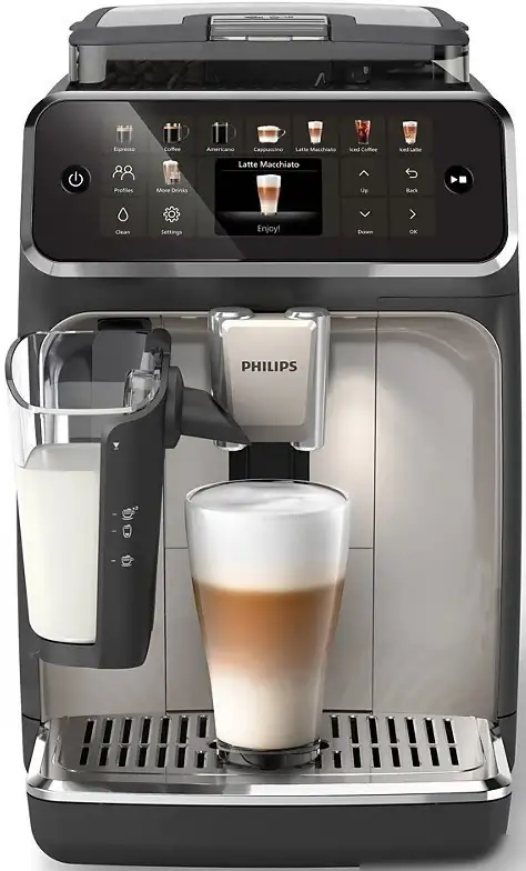 Кофемашина Philips LatteGo EP5547/90 предназначена для домашнего использования и не требует подключения к водопроводу. Она работает от сети с мощностью 1500 Вт и использует как зерновой, так и молотый кофе. В машине есть два встроенных бойлера и емкость для воды объемом 1,8 л, что позволяет приготовить несколько чашек подряд. Благодаря сенсорному управлению и цветному ЖК-экрану легко выбрать любимый рецепт или настроить параметры напитка. Машина предлагает более 10 программ, включая эспрессо, капучино, латте макиато и холодный кофе. Она автоматически поднимает молочную пену и регулирует крепость, температуру и объем напитка. Встроенный капучинатор создает насыщенную пену, а функция автоматической очистки облегчает уход за машиной. Регулировка высоты чашек позволяет использовать тару разных размеров. В комплект входит фильтр для воды, что улучшает вкус и сохраняет технику в рабочем состоянии.