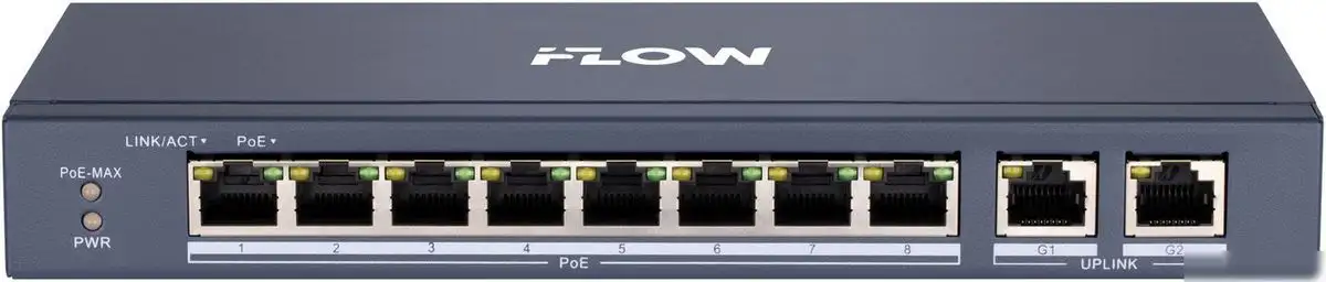 Неуправляемый коммутатор iFlow F-SW-EU410POE-V/L предназначен для подключения до 10 устройств в сети. Он обеспечивает скорость передачи данных до 5.6 Гбит/с и обрабатывает до 4.2 миллионов пакетов в секунду. Коммутатор оснащён 8 Fast Ethernet и 2 Gigabit Ethernet портами, что позволяет подключить устройства с разной скоростью. Благодаря поддержке PoE, он поставляет до 60 Вт энергии на 8 портов, что удобно для питания IP-камер, точек доступа и других устройств. Размеры устройства компактные: длина 217.6 мм и вес лёгкий. Он работает пассивным охлаждением и не использует управляемых функций, таких как VLAN или стекирование. Можно легко установить как на столе, так и на стене. Этот коммутатор отлично подходит для небольших офисов или домашних сетей, где важна простота и надежность.