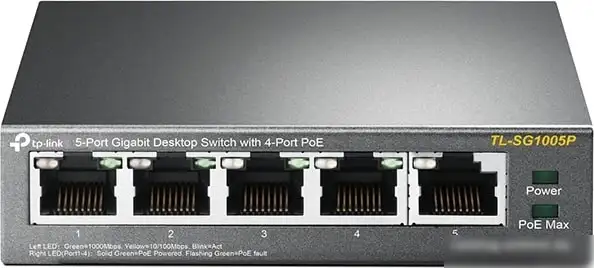 Коммутатор TP-Link TL-SG1005P — это простое устройство для работы в сети. Он не управляется и подключается в розетку. В нем есть 5 портов Gigabit Ethernet, которые обеспечивают быструю передачу данных до 10 Гбит/с. Через эти порты можно подключать компьютеры, принтеры или камеры видеонаблюдения. Четыре порта поддерживают питание по технологии PoE (802.3af), что позволяет питать подключенные устройства через один кабель. В коммутации реализована функция управления потоками (802.3x), которая защищает сеть от перегрузок. Поддерживается приоритет трафика (QoS), что улучшает качество передачи видео и голосовых данных. Устройство компактное и легко помещается в любом месте — его размеры 98x99,8x25 мм. Для упрощения работы есть таблица MAC-адресов на 2000 записей. Благодаря этим функциям, коммутатор подойдет для организации домашней или небольшой офисной сети.