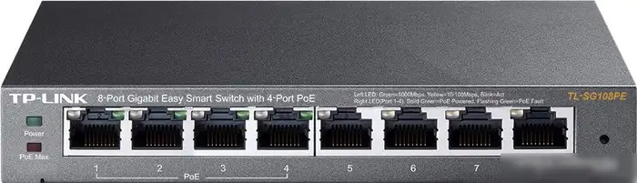 Коммутатор TP-Link TL-SG108PE — это настройваемое устройство с 8 Gigabit Ethernet портами, которое помогает легко управлять сетью. Он обеспечивает быстрый обмен данными со скоростью до 16 Гбит/с и пересылает пакеты с частотой 11.9 миллионов в секунду. Встроенная таблица MAC-адресов хранит до 4 тысяч записей, а буфер объемом 1.5 Мб позволяет обрабатывать много данных одновременно. Устройство поддерживает технологию PoE, которая питает подключённые устройства, такие как камеры или точки доступа, без необходимости отдельного источника питания. Благодаря функциям управления потоком данных, агрегации портов и VLAN, вы получаете стабильную и безопасную сеть. Для настройки используются веб-интерфейс и фирменная программа, что делает управление простым и удобным. Также коммутатор поддерживает мультикаст, зеркалирование портов и jumbo frames, что повышает его эффективность при работе с сложными задачами. Компактный размер и отсутствие необходимости в резервном питании позволяют удобно разместить устройство в любом офисе или серверной.