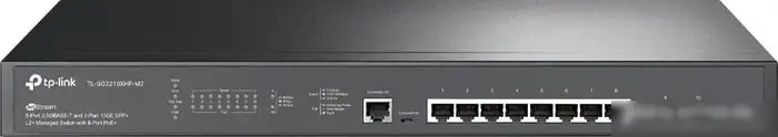 Управляемый коммутатор уровня 2+ TP-Link TL-SG3210XHP-M2 предназначен для настольного или стоечного монтажа и обладает высокой скоростью передачи данных — до 80 Гбит/с. Он обеспечивает обработку пакетов со скоростью 59.52 Mpps и поддерживает таблицу MAC-адресов на 16 тысяч записей. В устройстве есть 8 портов 2.5 Гбит/с на базе Ethernet GBASE-T для быстрой передачи данных. Оно не имеет PoE, но обладает двумя слотами SFP+ для подключения оптоволоконных модулей. Коммутатор управляется через веб-интерфейс, CLI, Telnet и SNMP, что облегчает настройку и контроль сети. Защита данных обеспечивается аутентификацией 802.1x, протоколами SSH, SSL и TLS. Встроенные функции включают управление потоком, jumbo frames до 9000 байт, поддержку VLAN и QoS для приоритетной обработки трафика. Устройство автоматически регулирует поток данных с помощью функции 802.3x. Для безопасности есть контроль широковещательного шторма и защищённые протоколы. Благодаря компактным размерам (440x180x44 мм), он легко интегрируется в разные сетевые области.