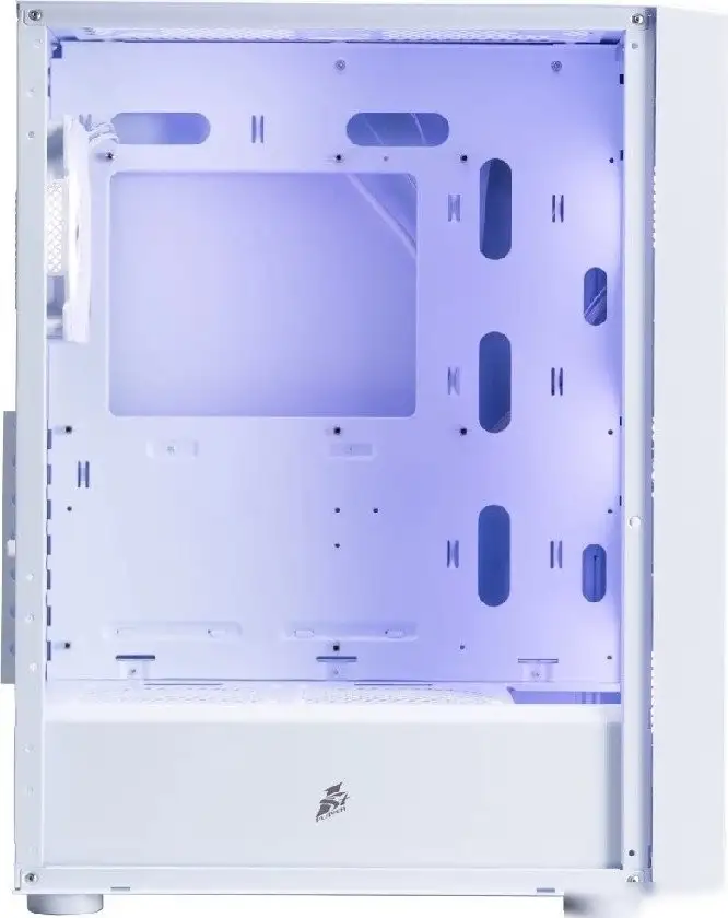 Корпус 1stPlayer GO6 ARGB белого цвета предназначен для сборки мощных игровых систем. Он подходит для материнских плат форматов ATX, micro-ATX и mini-ITX, а также поддерживает видеокарты длиной до 320 мм и процессорные кулеры высотой до 165 мм. В корпусе есть прозрачное стеклянное окно, через которое видно внутреннюю подсветку. Он оснащён четырьмя вентиляторами, управляемыми через PWM, и поддерживает установку до девяти вентиляторов для хорошего охлаждения. Можно также установить систему жидкостного охлаждения спереди до 360 мм и сверху до 240 мм. Внутри есть два отсека для накопителей 2.5" и один — для 3.5". Передняя панель включает USB 3.2 Gen1 порт, два USB 2.0, а также аудиоразъёмы. Корпус оборудован пылевыми фильтрами сверху и снизу для защиты компонентов. Он легко переносится благодаря наличию ручки и имеет современный дизайн с армированным закалённым стеклом. Размеры корпуса 480x210x373 мм, весит около 6 кг.