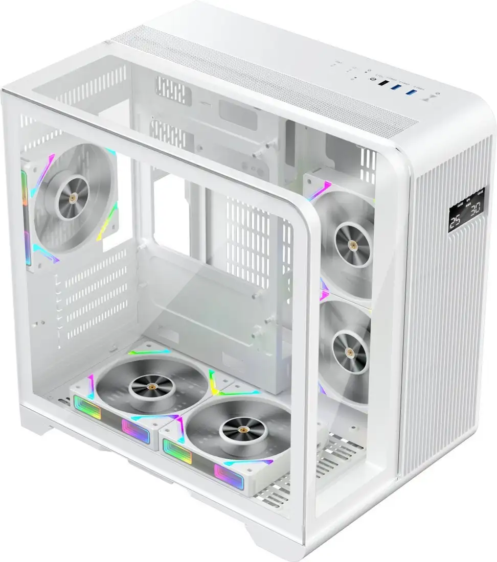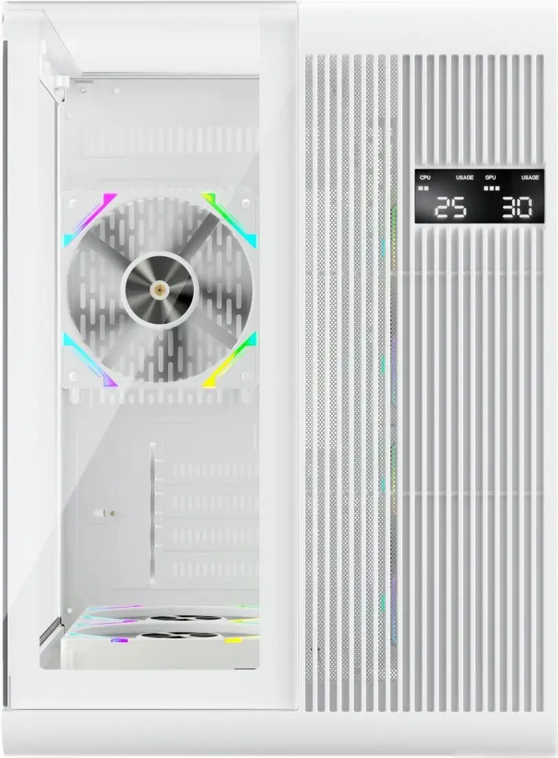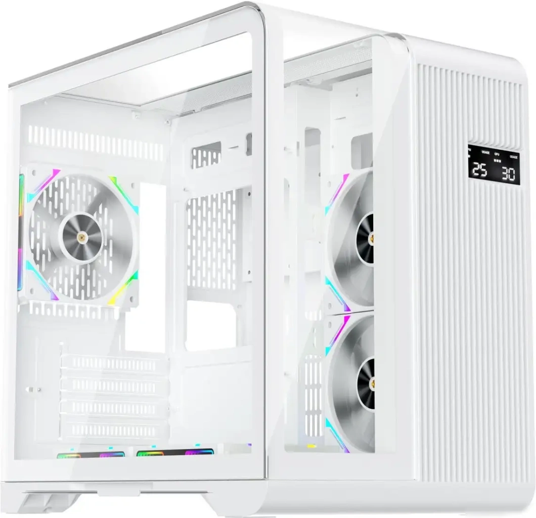 Корпус 1stPlayer RT5-WH — белый аквариумный корпус формата Mini Tower, выполненный из стальной ручки с прозрачным закаленным стеклом.С его помощью вы создадите стильную и прочную систему.Корпус поддерживает материнские платы форматов ATX и micro-ATX, а также позволяет установить видеокарту длиной до 330 мм и кулер высотой до 157 мм.В нем есть место для пяти вентиляторов, включая предустановленные и дополнительные для хорошей вентиляции.Корпус оборудован внутренним отсеком для двух 2.5-дюймовых накопителей и одним для 3.5-дюймовых, а также комбинированным отсеком для нескольких типов дисков.Расположен блок питания снизу, что способствует стабильной работе системы.На передней панели есть два порта USB 3.2 Gen1, один USB 2.0 и аудиовыходы, облегчающие подключение устройств.Общий вес корпуса 4.87 кг, он прочен и легко переносится благодаря ручке для переноски.Корпус не имеет подсветки, но оснащен пылевыми фильтрами и дверцей без замка, что делает его практичным для использования дома или в офисе.
