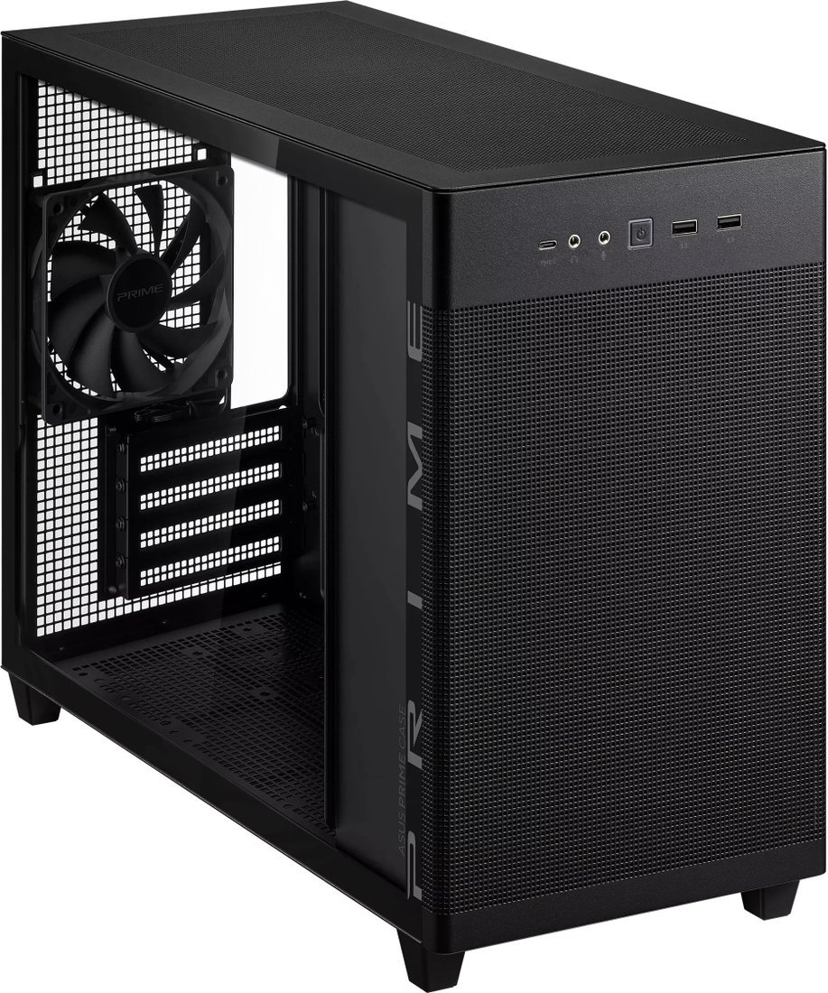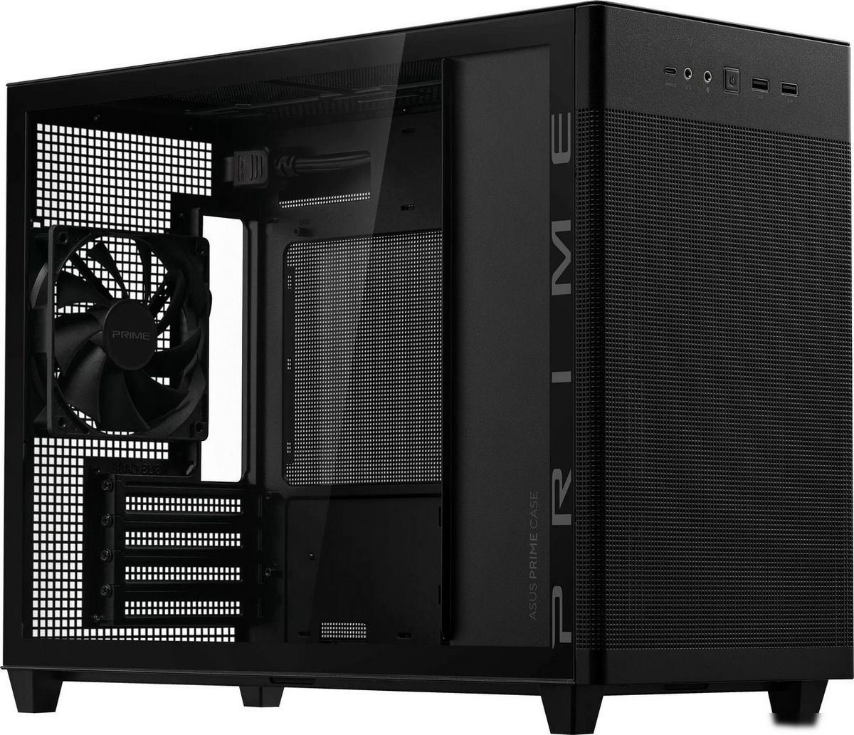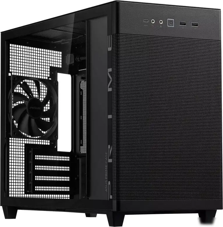 Корпус ASUS Prime AP201 TG черного цвета подходит для мини-таймера с размерами материнской платы micro-ATX и mini-ITX. Он имеет прозрачное закаленное стекло, которое показывает внутренности ПК. В корпусе есть место для до четырех вентиляторов, и в комплекте идет один вентилятор для хорошего охлаждения. Он поддерживает системы жидкостного охлаждения с радиаторами до 360 мм сверху и 120 мм сзади, что помогает сохранить оптимальную температуру компонентов. Внутри есть отсек для одного накопителя типа 2.5 дюйма и возможность установить три комбинационных блока для жестких дисков и SSD. На фронтальной панели есть порты USB 3.2 Gen1 и Gen2, а также USB-C для быстрого подключения устройств. Корпус легко собирается и обеспечивает хорошую вентиляцию благодаря пылевым фильтрам спереди. Он подходит для тех, кто хочет собрать мощную систему при ограниченном пространстве.