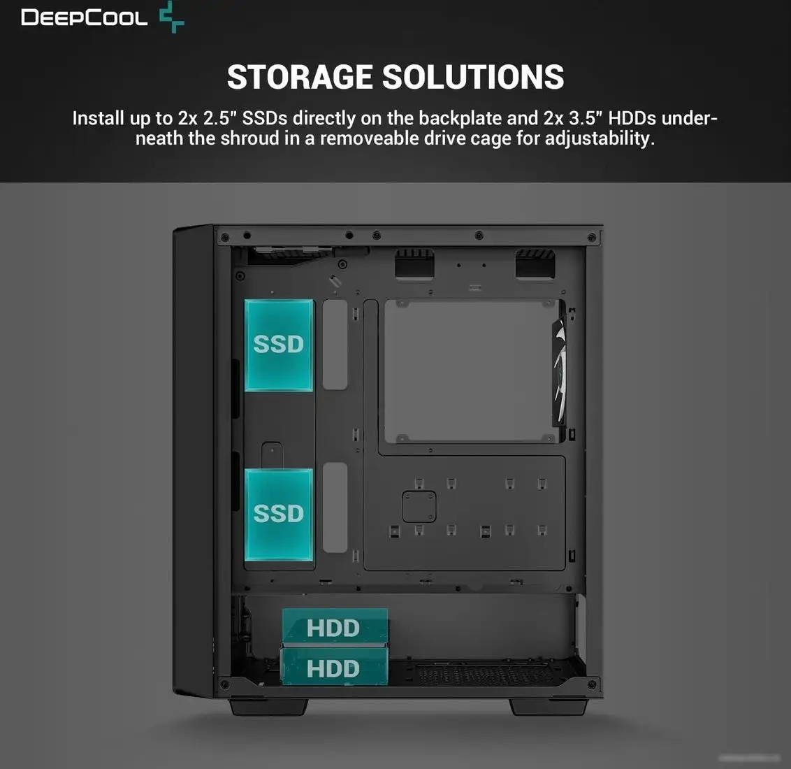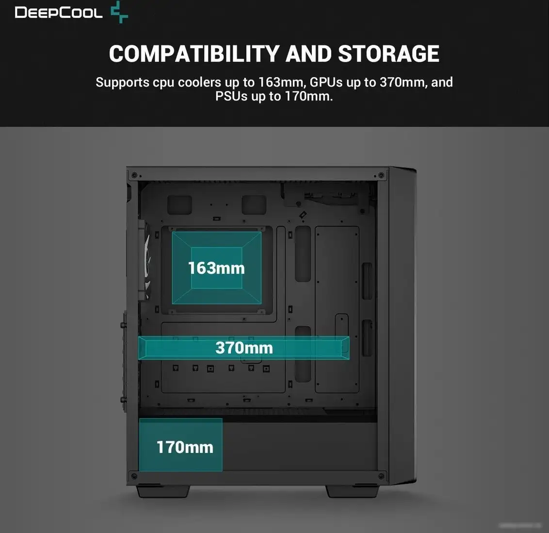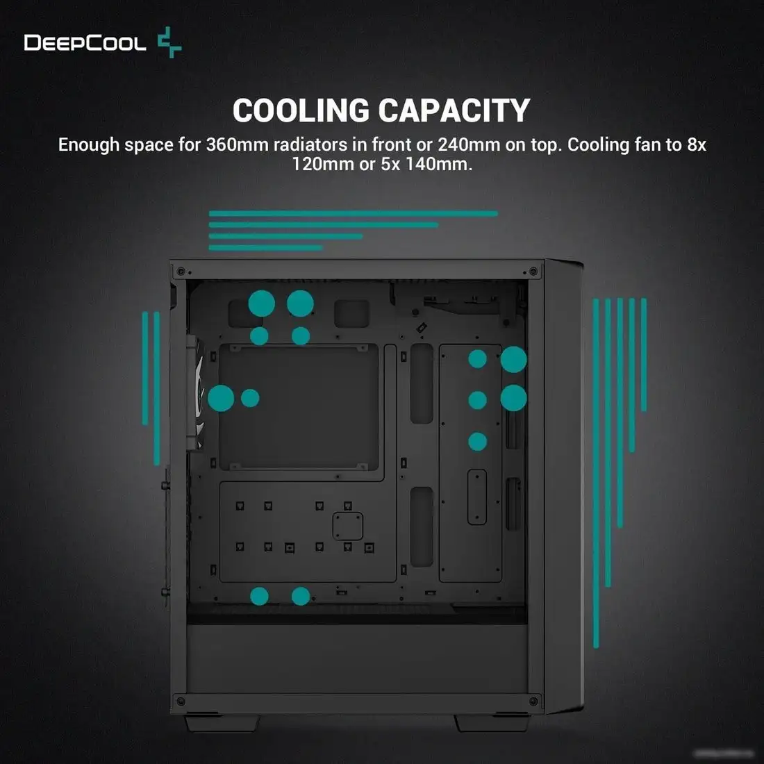 Корпус DeepCool CC560 V2 ARGB — это стильный и практичный Mid Tower для сборки ПК. Он подходит для материнских плат форматов ATX, micro-ATX и mini-ITX. В корпусе есть прозрачное окно из закаленного стекла, которое позволяет любоваться внутренним устройством и подсветкой вентиляторов. В комплекте идут четыре вентилятора с многоцветной ARGB-подсветкой, а также есть места для установки еще четырех вентиляторов. Поддерживается установка системы жидкостного охлаждения до 360 мм, что обеспечивает хорошее охлаждение компонентов. В корпусе есть фильтры для пыли, они помогают сохранить чистоту внутри. Возможна установка двух накопителей 2.5 дюймов и двух 3.5 дюймов для расширения памяти. На фронтальной панели расположены порты USB 2.0, USB 3.2 Gen1 и Gen2 для удобства подключения устройств. Корпус полностью выполнен из металла и пластика, он имеет компактные габариты и легко помещается в любую рабочую зону.