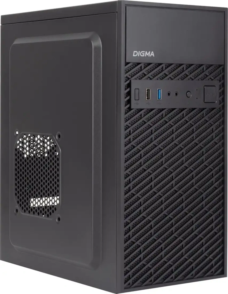 Корпус Digma DCC-MN303 — компактное решение форм-фактора Mini Tower, предназначенное для материнских плат micro-ATX и mini-ITX. Он позволяет установить процессорный кулер высотой до 110 мм и видеокарту длиной до 260 мм, а блок питания — не выше 160 мм. Корпус выполнен из пластика и металла, что обеспечивает прочность и лёгкость конструкции. В нём есть три места для вентиляторов: спереди и сбоку по 120 мм, сзади — 80 мм, что помогает эффективно охлаждать систему. Передняя панель оснащена мощными USB 3.2 и USB 2.0 разъёмами, а также двумя аудиоразъемами для удобства пользователя. Внутри размещаются до четырёх 2.5-дюймовых накопителей и два 3.5-дюймовых внутренняя отсека, обеспечивая достаточный объём для хранения данных. Благодаря хорошей вентиляции корпус обеспечивает стабильную работу компонентов и защиту от перегрева. Эта модель легкая (вес всего 2 кг), компактная и простая в сборке. Также у корпуса есть прозрачное окно и пылевые фильтры, хоть и отсутствует подсветка или дисплей.