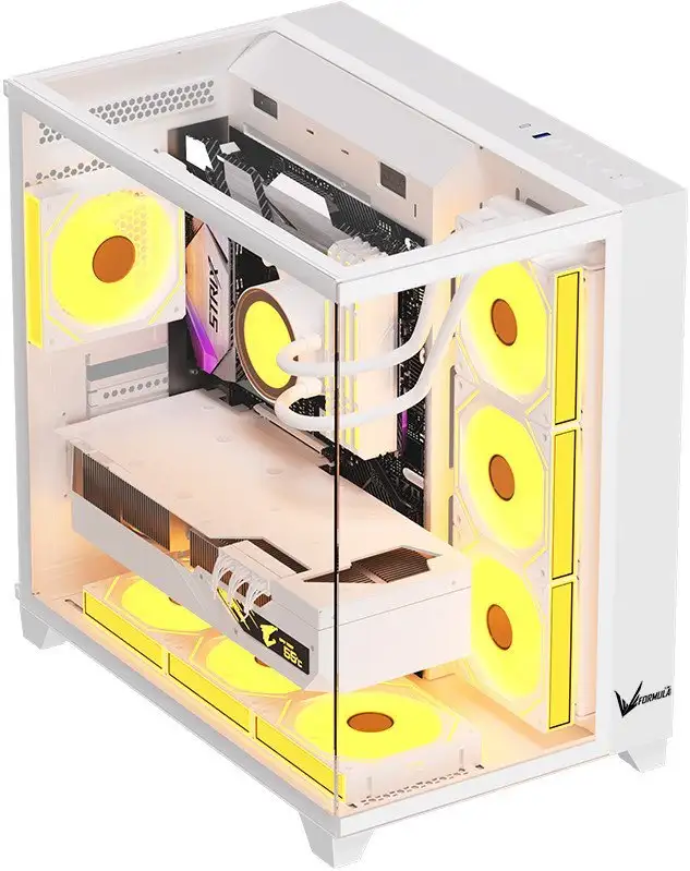 Корпус Formula Crystal Z9 в белом цвете сочетает стильный дизайн с высокой функциональностью. Он выполнен из металла и пластика, а передняя панель украшена закалённым стеклом с прозрачным окном, что позволяет показать внутри установленную систему. В корпусе есть место для материнской платы форматов ATX, micro-ATX и mini-ITX, а также для видеокарт длиной до 410 мм и процессорных кулеров высотой до 165 мм. Он поддерживает жидкостное охлаждение с радиаторами до 360 мм, что помогает эффективно охлаждать компоненты. В корпусе предусмотрено 6 мест для вентиляторов, но вентиляторы в комплекте не входят. Есть 3 внутренних отсека для 2.5-дюймовых накопителей и 2–3 внешних для 3.5-дюймовых устройств. В передней панели находятся два USB 3.2 Gen1 Type-A, один USB 3.2 Gen1 Type-C и два аудиоразъёма. Этот корпус легко обеспечивает хорошую вентиляцию и возможность установки современных систем охлаждения.