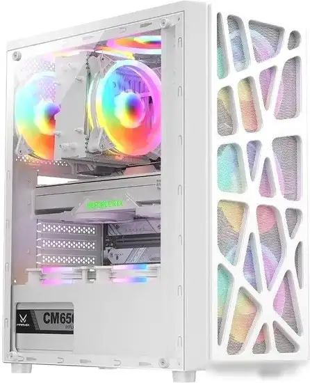 Корпус Formula Mana (белый) обладает прочной стальной конструкцией и прозрачным акриловым окном, которое позволяет увидеть внутренние компоненты. Этот Mid Tower подходит для материнских плат форматов ATX, micro-ATX и mini-ITX, что дает широкие возможности для сборки компьютера. В корпусе размещается до двух 3,5-дюймовых и двух 2,5-дюймовых накопителей, а благодаря размещению блока питания снизу обеспечивается хорошая вентиляция. В комплект входят три вентилятора спереди по 120 мм и один сзади, что помогает поддерживать оптимальную температуру системы, а также есть пылевые фильтры для защиты внутренних компонентов. Передняя панель оснащена интерфейсами USB 2.0, USB 3.2 Gen1 и Gen2, а также аудиовыходами для удобства подключения устройств. Максимальная длина видеокарты — 310 мм, а высота процессорного кулера — 160 мм, что позволяет установить мощную графику и кулеры большого размера. Корпус не имеет подсветки и дополнительных функций, но обеспечивает хорошую циркуляцию воздуха и возможность расширения благодаря семи слотам расширения. Размеры корпуса — 425 мм в высоту, 180 мм в ширину и 350 мм в глубину, он подойдет для стандартных игровых сборок.