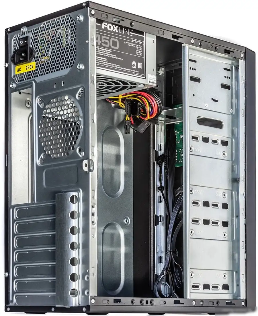 Корпус Foxline FL-301 выполнен в стиле Mid Tower и рассчитан для материнских плат формата ATX. Он позволяет установить процессорный кулер высотой до 150 мм и видеокарту длиной до 240 мм. Корпус выполнен из пластика и металла, имеет черный цвет и оснащён передней панелью с забором воздуха для лучшего охлаждения. Внутри есть 7 горизонтальных слотов расширения и места для различных накопителей: 2 гибких отсека 2.5 дюйма, 5 отсеков 3.5 дюйма (внутренние и внешние) и 1 отсек 5.25 дюйма. В корпусе предусмотрены 2 места для вентиляторов, но вентиляторы в комплект не входят. Он поддерживает блок питания мощностью до 450 Вт, расположенный сверху. Также есть USB 2.0 и USB 3.2 Gen1 порты для удобства подключения устройств, а также аудиоразъемы. Размеры корпуса — 405 мм в высоту, 175 мм в ширину и 330 мм в глубину.