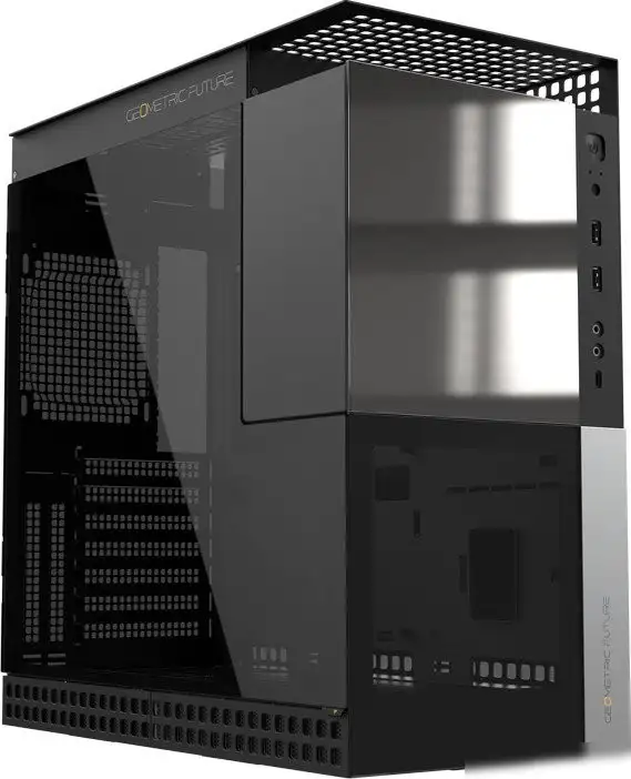 Корпус Geometric Future Model 4 Caliburn выполнен в черном цвете из прочной стали и имеет стильный дизайн с прозрачным стеклянным окном. Он подходит для установки материнских плат типа ATX, micro-ATX, eATX и mini-ITX, что дает широкие возможности для сборки компьютера. В корпусе есть место для установки видеокарт длиной до 310 мм и кулеров высотой до 164 мм, а также возможна установка блока питания длиной до 180 мм. Есть возможность для жидкостного охлаждения с радиаторами до 360 мм на снизу и до 240 мм сверху корпуса.