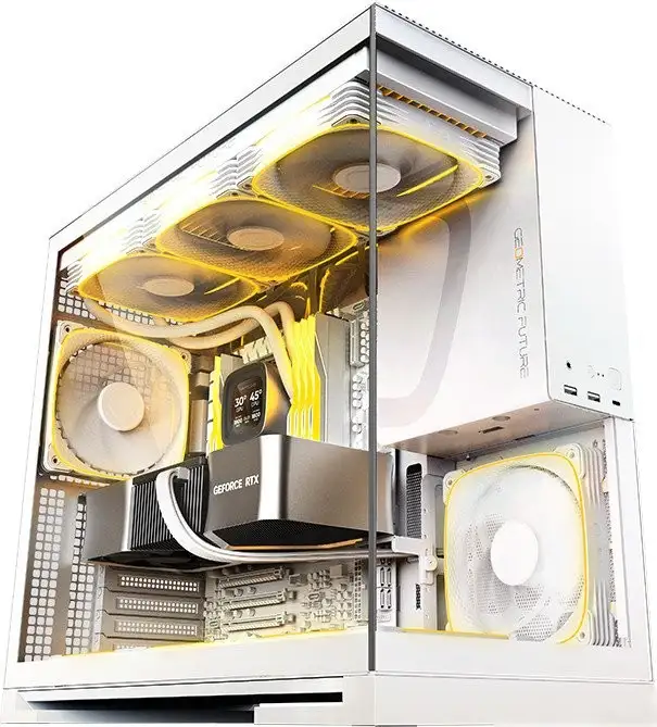 Корпус Geometric Future Model 5 — это стильный белый корпус для компьютера в формате Mid Tower, выполненный из стали и с прозрачным закалённым стеклом. Он подходит для установки материнских плат различных размеров, включая ATX, micro-ATX и mini-ITX, а также обеспечит место для видеокарт длиной до 460 мм и кулеров высотой до 180 мм. В корпусе предусмотрено место для жидкостного охлаждения с поддержкой радиаторов до 420 мм сверху и 360 мм снизу. Благодаря 10 слотам для вентиляторов пользователь может выбрать эффективную систему охлаждения, а пылевые фильтры сохраняют чистоту внутри корпуса. На передней панели расположены два USB 3.2 Gen1 Type-A и один USB 3.2 Gen2 Type-C разъём для подключения устройств. Внутри есть специальный комбинированный отсек для накопителей 2.5 и 3.5 дюймов, а также семи горизонтальных и двух вертикальных слотов расширения. Корпус не оснащён подсветкой и ручками для переноски, но позволяет легко установить все необходимые компоненты и обеспечить хорошую вентиляцию. Его размеры — 440 мм в высоту, 242 мм в ширину и 480 мм в глубину, что позволяет удобно разместить внутри всё необходимое.