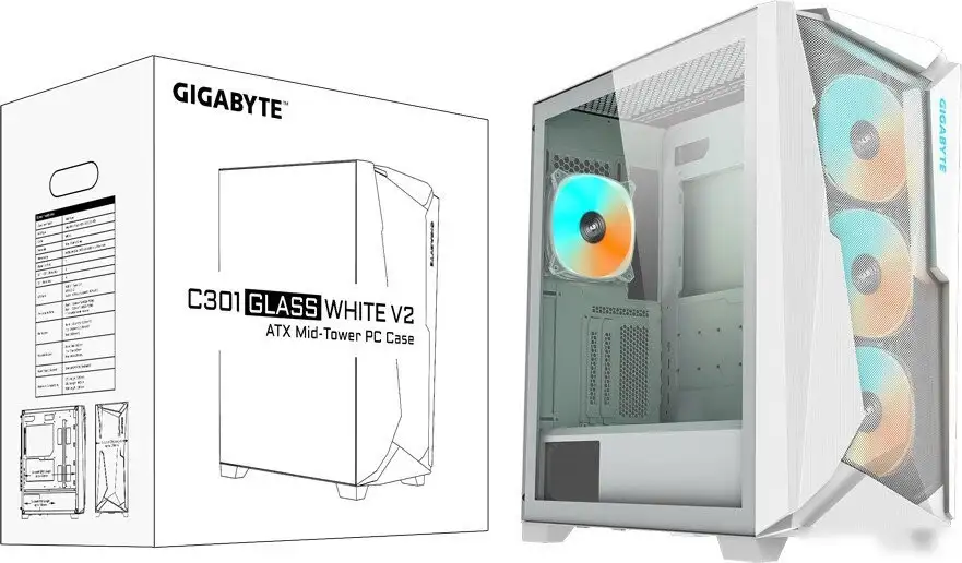 Корпус Gigabyte C301 Glass V2 в белом цвете отлично подходит для тех, кто хочет собрать мощный и стильный ПК. Он поддерживает материнские платы форматов eATX, ATX, micro-ATX и mini-ITX, а также обеспечивает место для видеокарт длиной до 400 мм и процессорных кулеров до 170 мм. В корпусе установлено 4 вентилятора размером 120 мм — трое спереди и один сзади, что помогает эффективно охлаждать компоненты. Также есть возможность подключить дополнительные вентиляторы или жидкостное охлаждение до 360 мм сверху и спереди корпуса. Светодиодная ARGB-подсветка вентиляторов создаст эффектный внешний вид. На передней панели расположены двойные USB 3.2 и USB Type-C разъемы, которые обеспечивают быструю передачу данных. Корпус выполнен из металла, стекла и пластика, обладает прозрачной панелью из закаленного стекла и пылевыми фильтрами сверху и снизу. Внутри есть два отсека для 2.5-дюймовых дисков и два для 3.5-дюймовых, что позволяет удобно организовать хранение. Этот корпус отлично сочетает стиль, хорошую вентиляцию и поддержку современных компонентов.