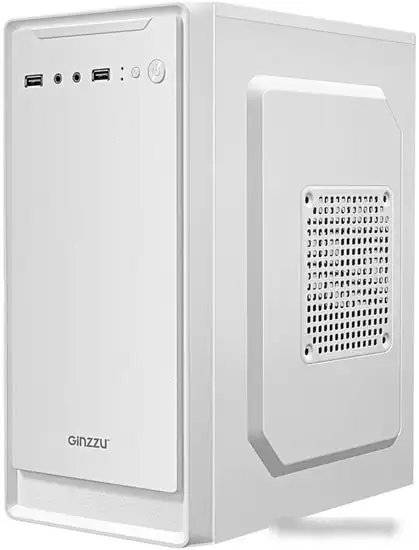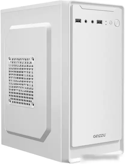 Корпус Ginzzu B185 — это небольшой мини-тower, выполненный из стали с белым пластикором. Он подходит для материнских плат формата micro-ATX и вмещает видеокарты длиной до 260 мм. Корпус имеет два внутренние отсека для SSD или жестких дисков, а также четыре слота расширения для различных компонентов. Передняя панель оборудована двумя портами USB 2.0 и одним аудиоразъемом для подключения периферии. Блок питания располагается сверху, что обеспечивает хорошую вентиляцию системы. В корпусе есть возможность установить до трех дополнительных вентиляторов для улучшенного охлаждения. Он легко переносится благодаря весу всего 1.99 кг и компактным размерам: 300 мм в высоту, 183 мм в ширину и 340 мм в глубину. Устройство не оснащено встроенной подсветкой и дополнительными функциями подключения, потому подходит для простых конфигураций. Его основное преимущество — компактность и возможность установки различных компонентов без лишних затрат.