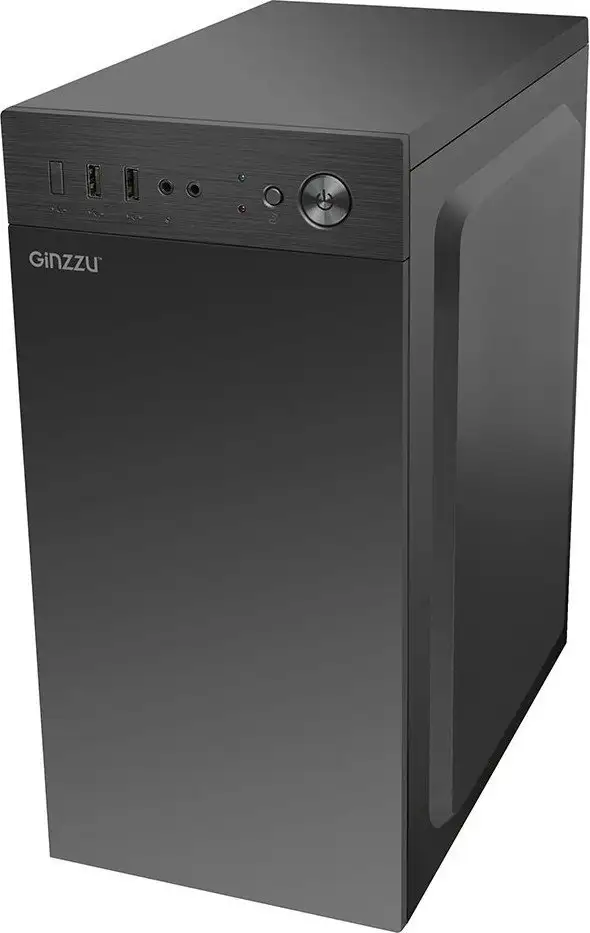 Корпус Ginzzu B400 выполнен из прочной стали и имеет черный цвет. Он подходит для материнских плат типа micro-ATX и mini-ITX, а длина видеокарты не превышает 260 мм. В корпусе есть два внутренних отсека для накопителей 2.5 и 3.5 дюймов, что удобно для хранения данных. Передняя панель сделана из пластика и оснащена воздухозаборником для улучшения вентиляции. Внутри есть места для установки двух вентиляторов: 12 см спереди и 8 см сзади, что помогает поддерживать низкую температуру компонентов. Максимальная высота процессорного кулера — 145 мм, а длина блока питания — ATX. Корпус обеспечивает доступ к USB 2.0 и USB 3.2 Gen1, а также аудиовыходом для наушников и микрофона. Он легко переносится за счет небольших габаритов и веса 1.47 кг.