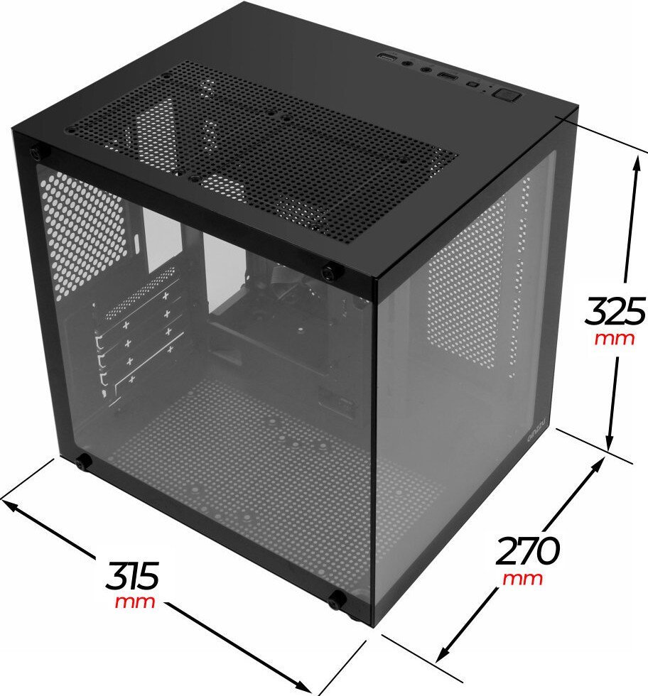 Mini Tower, БП отсутствует, для плат micro-ATX/mini-ITX, без вентиляторов в комплекте, окно: закаленное стекло, видеокарта до 320 мм, охлаждение ЦП до 155 мм, 1xUSB 2.0, 1xUSB-A 3.2 5Гбит/с, цвет черный
