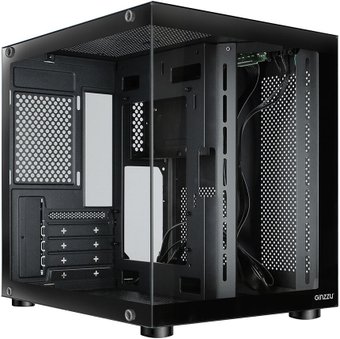 Корпус Ginzzu V100 выполнен в компактном формате Mini Tower и подходит для материнских плат micro-ATX и mini-ITX. Он выполнен из пластика, металла и закалённого стекла, что обеспечивает прочность и современный внешний вид с прозрачным окном. Благодаря вместимости для четырёх вентиляторов и просторной внутренней конструкции, он хорошо справляется с охлаждением системы. В корпусе есть отсек для 2.5-дюймовых накопителей и место для внутреннего 3.5-дюймового диска, что удобно для хранения. Передняя панель оснащена несколькими USB-портами, включая USB 3.2 Gen1 Type-A и Type-C, а также аудиоразъемами. Корпус достаточно лёгкий — вес около 3.2 кг, и легко переносится благодаря компактным размерам. Его дизайн с прозрачным стеклом делает сборку более привлекательной и позволяет показать внутренние компоненты. Он подходит для тех, кто ищет функциональный, стильный и компактный корпус для ПК.