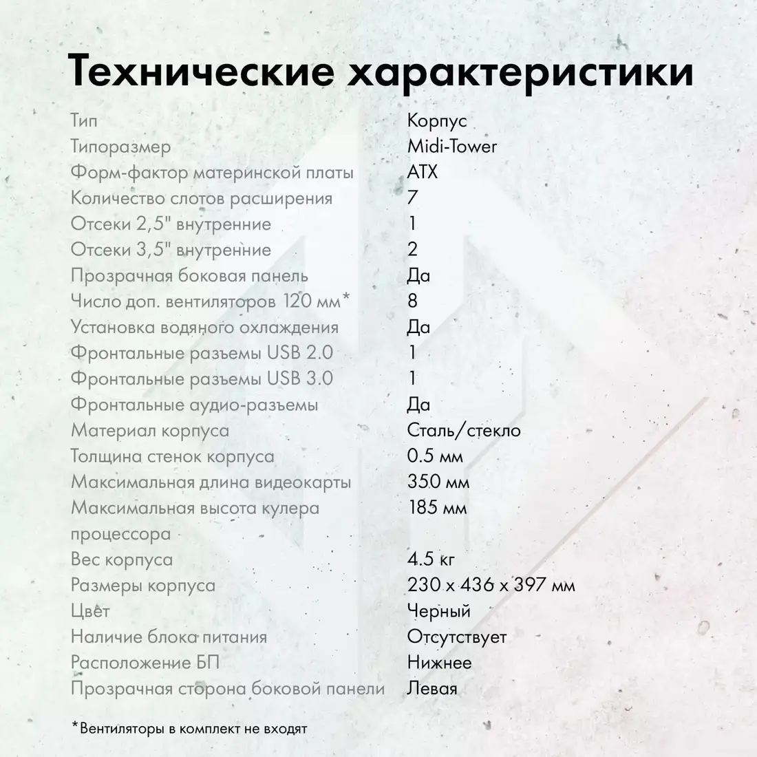 Mid Tower, БП отсутствует, для плат ATX/micro-ATX/mini-ITX, окно: закаленное стекло, видеокарта до 350 мм, охлаждение ЦП до 185 мм, пылевые фильтры, 1xUSB 2.0, 1xUSB-A 3.2 5Гбит/с, цвет черный
