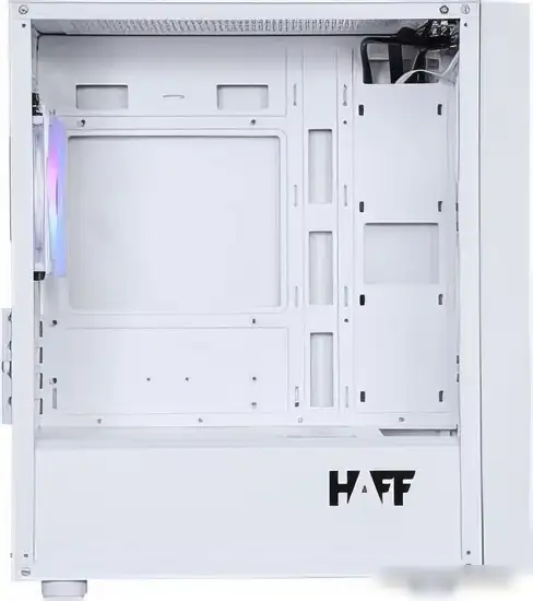 Корпус HAFF Flash — это удобное решение для игровых сборок. Он выполнен в формате Mid Tower и имеет белый цвет с прозрачным окном из закалённого стекла, что позволяет показывать внутренние компоненты. Передняя панель украшена сеткой, которая обеспечивает хороший воздушный поток. Внутри можно установить материнские платы форматов micro-ATX и mini-ITX, а блок питания располагается снизу корпуса. В комплект входят четыре вентилятора: три спереди и один сзади, что помогает эффективно охлаждать систему. Открытые вентиляционные отверстия и вентиляция корпуса способствуют хорошей циркуляции воздуха без шума. На передней панели расположены два USB 2.0 и один USB 3.2 Gen1 Type-A, а также аудиовыход для наушников и микрофона. Это устройство хорошо подойдет для тех, кто хочет собрать мощную игровую систему и следит за аккуратностью внутри корпуса.