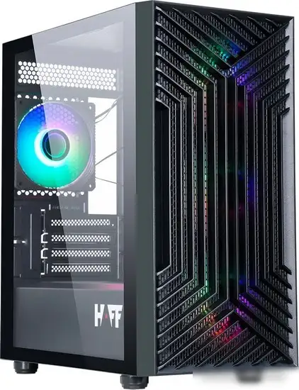 Корпус HAFF Rush — мини-корпус в черном цвете, выполнен из стали, пластика и стекла с прозрачным окном, позволяющим видеть внутренности. Он поддерживает материнские платы форматов micro-ATX и mini-ITX и рассчитан на видеокарты длиной до 330 мм и кулеры высотой до 160 мм. В корпусе есть место для установки жидкостного охлаждения спереди, сверху и сзади, с поддержкой радиаторов до 280 мм. Встроены 4 вентилятора с адресной RGB-подсветкой, что помогает регулировать температуру внутри и украшать систему. В корпусе есть 2 отсека для SSD и 2 для HDD, а также 4 слота для дополнительных накопителей. Пылевые фильтры защищают от пыли, а вентиляторы и USB-порты обеспечивают удобство подключения устройств. Он занимает мало места, при этом обеспечивает хорошую вентиляцию и совместимость с современными компонентами.