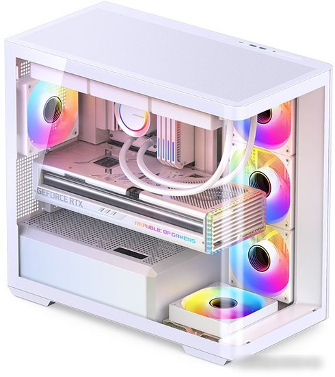 Корпус Jonsbo D300 белого цвета отлично подходит для игровых компьютеров. Он выполнен из прочной стали с прозрачным закалённым стеклом, которое показывает внутри устройство. В корпусе есть место для материнских плат формата micro-ATX и mini-ITX, а блок питания размещён снизу. Он поддерживает жидкостное охлаждение с радиаторами до 360 мм сверху и 120 мм сзади, что помогает сохранить температуру компонентов. В корпусе предусмотрено до восьми вентиляторов, что обеспечивает хорошую вентиляцию системы. Есть два отсека для SSD и комбинированный для HDD/SSD с безвинтовым креплением. Он оснащён разъёмами USB 3.2 и аудиовыходом для удобства подключения устройств. Максимальная длина видеокарты — 430 мм, а высота кулера — 180 мм, что подходит для мощных комплектующих. Корпус лёгкий, компактный и содержит пылевые фильтры для защиты внутри.