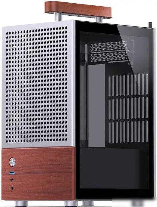 Корпус Jonsbo T6 серебристого цвета отлично подходит для сборки компактных игровых систем. Он выполнен из стали и закаленого стекла, что делает его прочным и стильным. В корпусе есть прозрачное окно, через которое видно внутренности компьютера. Он поддерживает материнские платы формата mini-ITX и имеет два слота для расширения. Максимальная длина видеокарты — 215 мм, а высота процессорного кулера — 160 мм, что обеспечивает хорошую совместимость с разными компонентами. На передней панели расположены порты USB 3.2 Gen1 Type-A и Type-C для быстрого подключения устройств, а также аудиовыход. Отличительной особенностью корпуса является возможность установки двух вентиляторов для хорошего охлаждения. Для хранения данных есть два слота для SSD, но без встроенного блока питания. Вес корпуса составляет 3,5 кг, и он легко переносится благодаря ручке. Размеры корпуса – 332x185x223 мм, что удобно для небольших рабочих пространств.