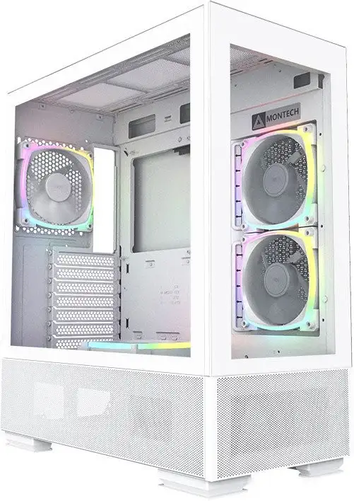 Корпус Montech Sky Two белого цвета отлично подходит для игр и сборки мощных компьютеров. Он выполнен из стали и закаленного стекла, что обеспечивает прочность и стильный вид. Передняя панель из стекла с забором воздуха помогает лучше охлаждать систему. В корпусе поддерживаются материнки форматов ATX, micro-ATX и mini-ITX, а блок питания располагается снизу. Есть место для жидкостного охлаждения мощностью до 360 мм спереди и сверху, что улучшает охлаждение компонентов. В комплект входит 4 вентилятором с адресной RGB-подсветкой, которую можно настроить для индивидуального стиля. Внутри вместятся видеокарты длиной до 400 мм и кулеры высотой до 168 мм. На передней панели есть порт USB 3.2 Gen 2 Type-A и USB 2.0, а также аудиовыход и вход для микрофона. Корпус оснащен пылевыми фильтрами для чистоты внутри и обладает хорошей вентиляцией.