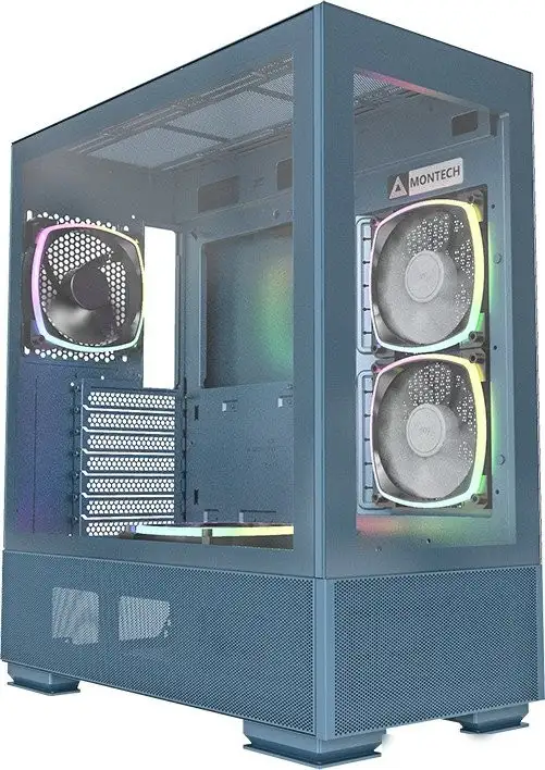 Корпус Montech Sky Two в синем цвете создан для игровых компьютеров и поддерживает материнские платы форматов ATX, micro-ATX и mini-ITX. Он изготовлен из стали и стекла, с прозрачным боковым окном, чтобы показать внутренности системы, и передней панелью из стекла с воздухозаборником. В корпусе есть место для установки до 8 вентиляторов, из которых уже установлены 3 вверху и 1 сзади, а также есть подсветка вентиляторов ARGB. Он позволяет организовать жидкостное охлаждение с радиаторами до 360 мм сверху и 280 мм сбоку, что помогает системе оставаться прохладной. Внутри размещаются жесткие диски и SSD, а также обеспечено хорошее вентиляционное охлаждение. Корпус подходит для видеокарт до 400 мм в длину и процессорных кулеров до 168 мм, его размеры — высота 490 мм, ширина 215 мм и глубина 430 мм. На передней панели есть USB 3.2, USB 2.0 и аудиоразъемы для удобства подключения устройств. Этот корпус сочетает стильный дизайн и функциональность, делая его хорошим выбором для игровых систем.