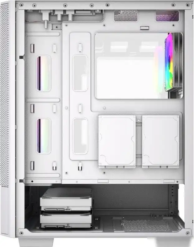 - Многоцветная ARGB-подсветка вентиляторов — создаёт яркую подсветку внутри корпуса.