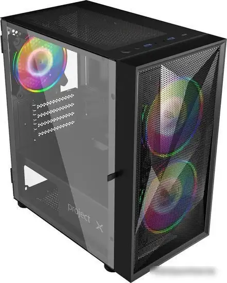 Корпус Project X Hyperion — мини-корпус в черном цвете, выполненный из стали с прозрачным закаленным стеклом. Он подходит для материнских плат формата micro-ATX и mini-ITX и имеет верхний и нижний пылевые фильтры для защиты компонентов. Передняя панель оснащена сеткой, что обеспечивает хорошую вентиляцию, а в корпусе расположены 4 слота для расширения и место для хранения двух дисков 2.5/3.5 дюймов. Он поддерживает установку жидкостного охлаждения с радиаторами до 240 мм спереди и сверху, а также комплектуется тремя вентиляторами с ARGB-подсветкой и возможностью подключения через USB 3.2 и Type-C. Максимальная длина видеокарты — 295 мм, высота кулера — 160 мм, а длина блока питания — до 165 мм. Корпус не имеет встроенного контроллера подсветки и не оснащен дверцей или замком, что упрощает доступ и сборку. Он хорошо подойдет для энтузиастов, желающих собрать мощный игровой ПК с хорошей вентиляцией и стильным дизайном.