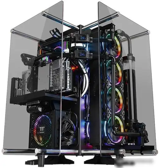 - Прозрачное закалённое стекло — создаёт стильный внешний вид и демонстрирует внутренние компоненты.