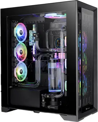 Корпус Thermaltake CTE T500 TG ARGB — это большой полный корпус для ПК, выпущенный в 2023 году. Он выполнен из стали и черного цвета, а боковая панель сделана из закаленного стекла, чтобы можно было красиво показать компоненты внутри. Такой корпус подходит для разных размеров материнских плат — ATX, micro-ATX, eATX и mini-ITX, а также позволяет установить видеокарту длиной до 385 мм и кулер высотой до 195 мм. На лицевой стороне есть вентиляционная решетка для хорошего воздуха и подсветка ARGB, которая добавляет стиль. В корпусе уже установлены три вентилятора с ARGB подсветкой, а всего можно установить до 11 вентиляторов. Он поддерживает системы жидкостного охлаждения радиусом до 420 мм спереди, сверху или сзади. Корпус оснащен достаточным количеством разъемов USB и аудио для подключения устройств, а также защищен пылевыми фильтрами со всех сторон.