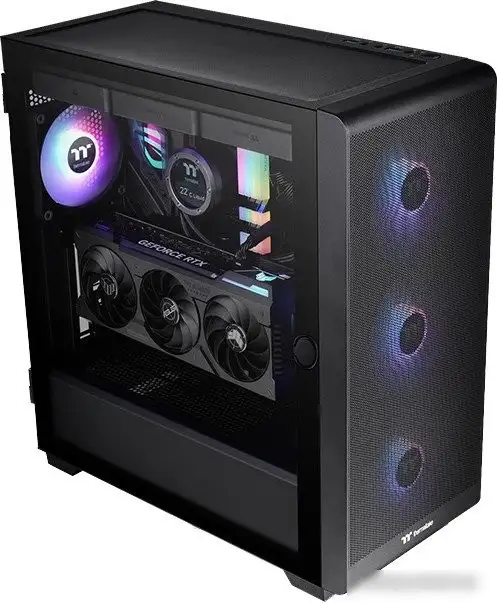 Корпус Thermaltake S250 TG ARGB хорошо подойдет для тех, кто хочет собрать мощный компьютер. Он выполнен из пластика и металла с прочным закалённым стеклом на передней панели, через которое видно встроенную подсветку ARGB. В корпус можно установить материнские платы формата ATX, micro-ATX, eATX и mini-ITX, а также видеокарты длиной до 400 мм. Максимальная высота процессорного кулера — 165 мм для удобства охлаждения. Встроенные 4 вентилятора с многоцветной подсветкой обеспечивают хорошее охлаждение, а также есть возможность установить дополнительные вентиляторы или жидкостное охлаждение до 420 мм. Есть места для хранения двух SSD-дисков и одного классического 3,5-дюймового накопителя в универсальном отсеке. Корпус оснащен пылевыми фильтрами на верхней, передней, нижней и боковой стенке, что помогает поддерживать чистоту внутри. Управление вентиляторами осуществляется через встроенный контроллер, что удобно при настройке температуры. Размеры корпуса составляют 490 мм в высоту, 218 мм в ширину и 462 мм в глубину, а вес — около 7.5 кг. Благодаря прочной конструкции и расширенным возможностям охлаждения он подходит как для игровой, так и для рабочей системы.
