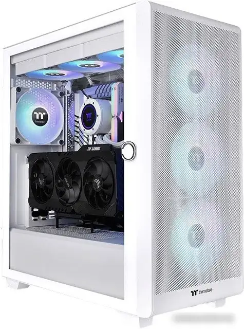 Корпус Thermaltake S250 TG ARGB Snow идеально подходит для сборки мощного ПК. Он выполнен из пластика и металла в белом цвете и оснащен прозрачным закаленным стеклом, которое показывает внутренности. В корпусе есть место для материнских плат форматов ATX, micro-ATX, eATX и mini-ITX. Максимальная высота процессорного кулера — 165 мм, а длина видеокарты — 400 мм, что позволяет установить современные компоненты. На передней, верхней, нижней и боковой стенках расположены пылевые фильтры для защиты от пыли. В системе можно установить до 10 вентиляторов, комплектующие идут с четырьмя, и есть поддержка жидкостного охлаждения радиаторами до 420 мм. На передней панели есть два USB 3.2 Gen 1 и один USB Type-C для быстрого подключения устройств. Также есть контроллер подсветки ARGB, который помогает настраивать цвет и режим подсветки. Корпус обеспечивает хороший поток воздуха и защищает компоненты от пыли. Его размеры — 490 мм в высоту, 218 мм в ширину и 462 мм в глубину, вес около 7,5 кг. Внутри есть два отсека для SSD и возможность крепления накопителей без винтов.