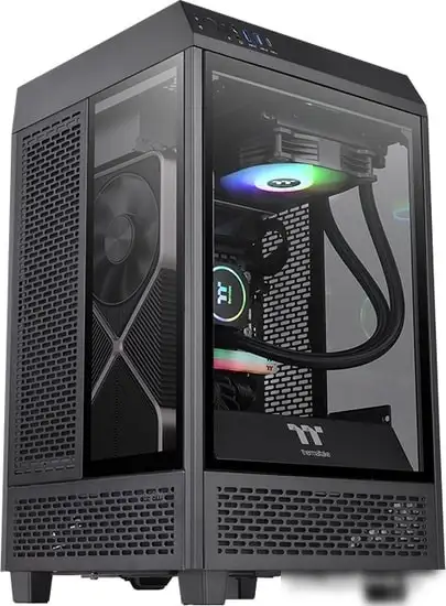 Корпус Thermaltake The Tower 100 Mini — это компактное решение для игрового ПК в черном цвете. Он изготовлен из прочной стали с красивым стеклянным окном, которое позволяет увидеть внутри систему. В корпусе есть место для материнской платы mini-ITX, а также возможности для установки видеокарт длиной до 330 мм и высокого процессорного кулера до 190 мм. Он поддерживает воздушное охлаждение и даже жидкостное, а внутри поместится до трех вентиляторов. В комплекте идут уже два кулера, а на front-панели есть порты USB 3.2 и аудиоразъемы. Корпус оснащен пылевыми фильтрами и имеет удобное комбинированное отсек для дисков. Это хороший вариант для тех, кто хочет собрать компактный и стильный игровой ПК.
