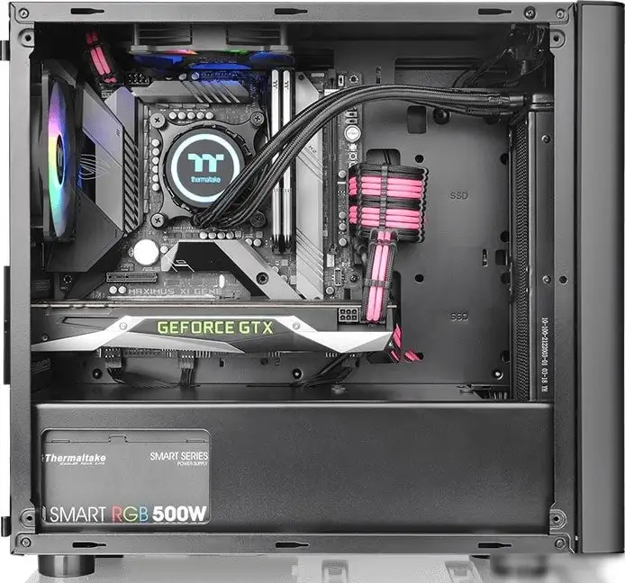Корпус Thermaltake V150 CA-1R1-00S1WN-00 выполнен в мини-тору формате и подходит для материнских плат micro-ATX и mini-ITX. Он поддерживает процессорные кулеры высотой до 155 мм и видеокарты длиной до 350 мм без переднего кулера, а блок питания должен иметь длину не более 220 мм. Корпус выполнен из пластика, металла и стекла, оснащен прозрачным закаленным стеклом, что красиво показывает внутренние компоненты. В конструкции есть 4 горизонтальных слота расширения для установки видеокарт и других устройств. Он позволяет установить до шести вентиляторов, в комплекте есть один, обеспечивающий хорошее охлаждение. Есть пылевые фильтры сверху и снизу корпуса, чтобы внутри было чище. В передней панели находятся два USB 2.0, один USB 3.2 Gen1 и два аудиоразъема, что удобно для подключения устройств. Корпус рассчитан на две 2.5-дюймовые накопители, есть внутренние отсеки для них, а блок питания располагается снизу для стабильности. В целом, он легкий, компактный и удобный для установки и эксплуатации.
