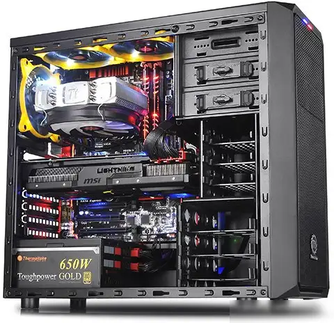 Корпус Thermaltake Versa H25 — это геймерский корпус без блока питания, выполненный из прочной стали и окрашенный в черный цвет. Он имеет форм-фактор Tower, подходит для материнских плат ATX и micro-ATX, и располагается блок питания внизу для лучшей вентиляции. Корпус оснащен воздушным и жидкостным охлаждением, что помогает поддерживать низкую температуру компонентов. Внутри есть три отсека для 3.5", два для 5.25" и три для 2.5" жестких дисков, а также семь слотов расширения. В передней части расположены порты USB 2.0 и USB 3.0, а также аудиовыходы и вход для микрофона для удобства подключения устройств. Прозрачное окно на боковой стенке позволяет наблюдать за внутренними компонентами, а расположение видеокарты до 315 мм и высота процессорного кулера до 155 мм обеспечивают хорошую совместимость с различными комплектующими. Этот корпус не оснащен тихоизоляцией, ручкой для переноски и дверцами, что делает его простым и удобным в использовании для геймеров и сборщиков ПК.